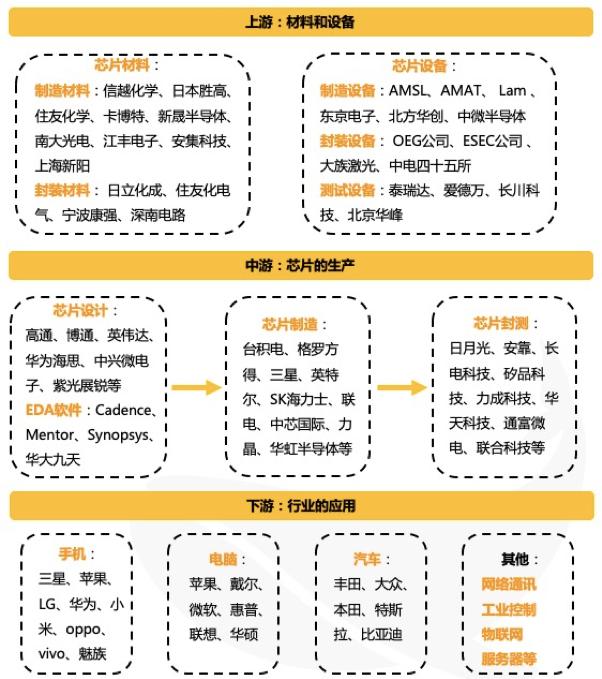 从集成电路产业链角度来看,材料和设备位于产业链上游,对集成电路的发展起着支撑作用,中游为芯片的生产,又可以分为设计、制造、封测三个环节。下游为芯片各类细分市场的应用,比如手机、电脑、汽车、物联网、网络通讯等。