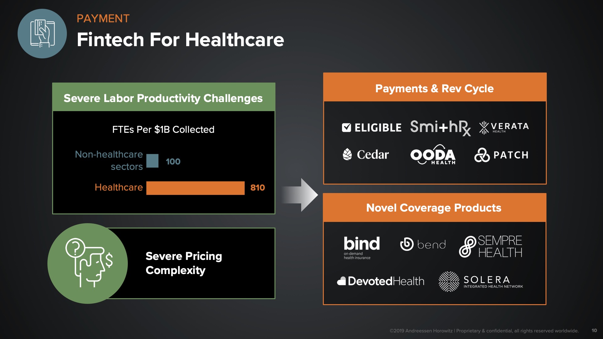 一旦你确定了你要去哪里接受治疗,你就会非常关心如何支付治疗费用。 在“金融科技用于医疗保健”这一类别中,我们看到了两个方面的机遇。
