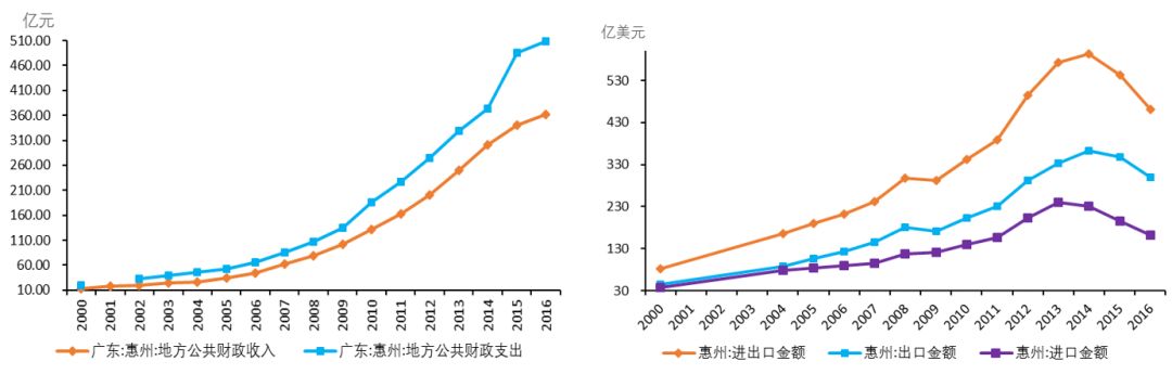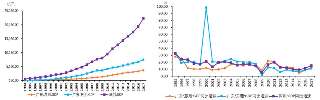 在经济方面,东莞、惠州和深圳保持了较为一致的增长速度,这两个城市有较大的发展潜力。2017年,东莞GDP比增长8.2%,高于全省7.5%的平均水平。惠州GDP增速相仿。在人均GDP方面,惠州更表现出追赶之势。
