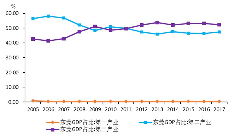 东莞的第一产业占比极小,第二、三产业基本各占比一半。东莞相比香港、深圳和广州经营成本更低。目前,东莞正努力提高城市创新能力,力求成为粤港澳大湾区的先进制造业中心。