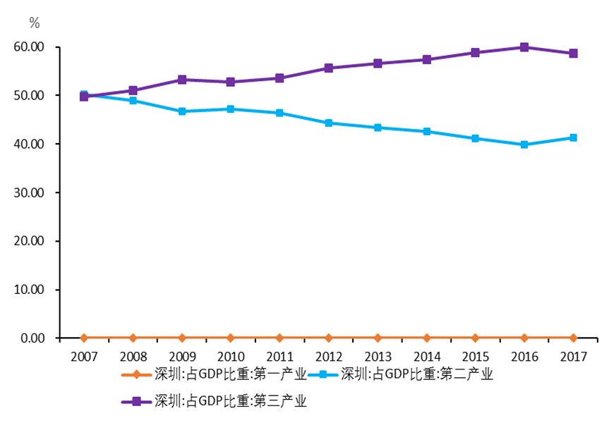2017年,深圳先进制造业占工业比重超过75%;第三产业占比在2008年超过50%,在2016年达到60%。
