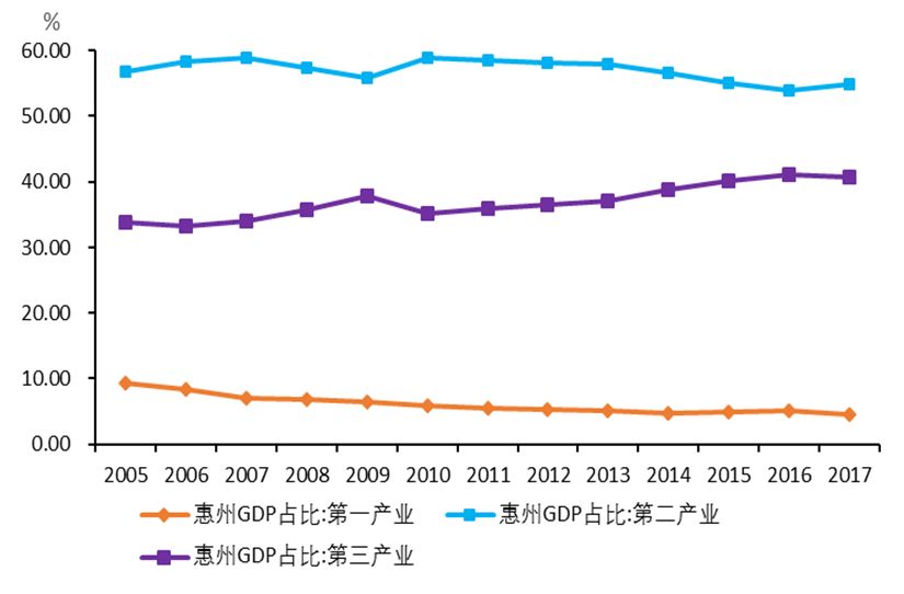 惠州第一产业占比较小,从2005年的10%不断下降。与此同时,第二产业占比平稳,第三产业快速发展。近年来,惠州逐步完善了产业体系。深圳地铁延伸至惠州市,有利于惠、深间的物流、贸易与人才流动等。