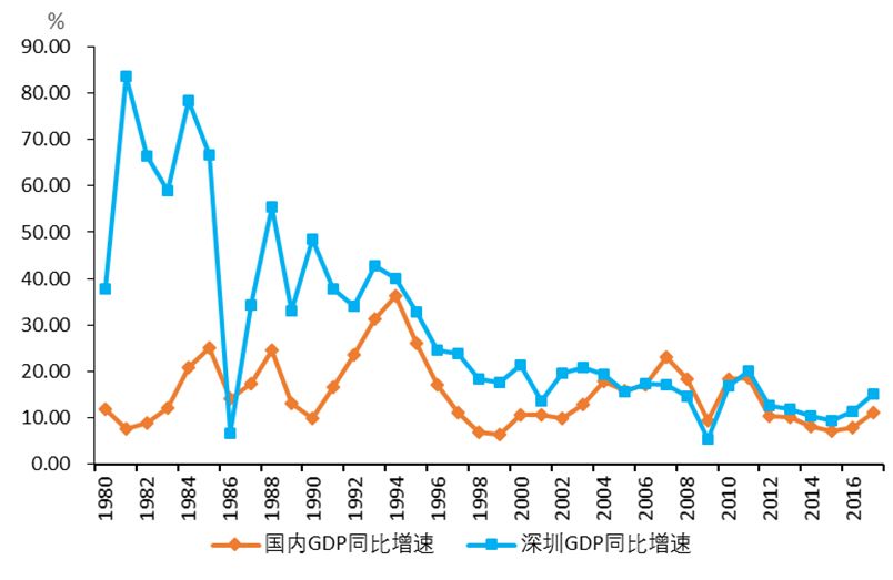 深圳GDP同比增速明显高于同期内全国GDP同比增速