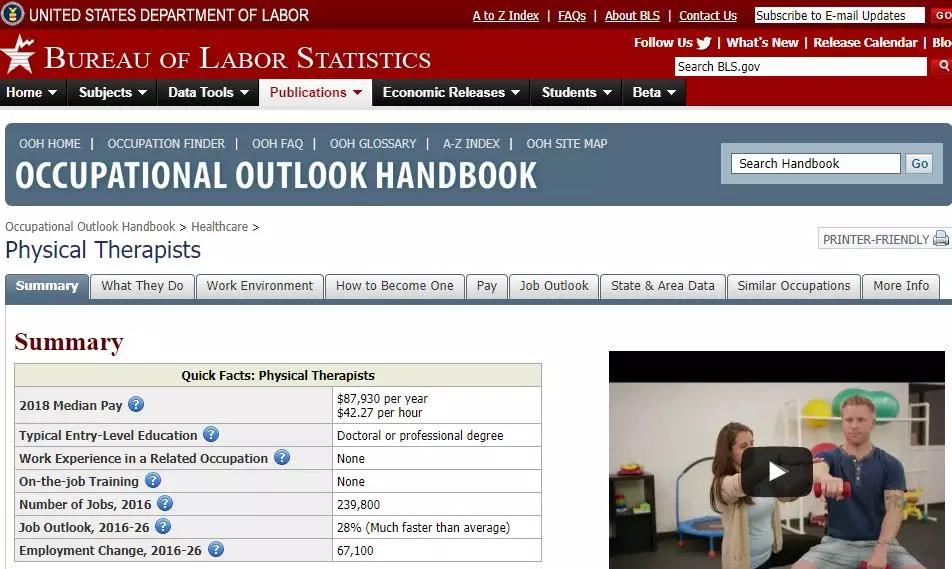 根据美国劳工部统计,2018年美国物理治疗师的平均薪资为每年8.7万美元,时薪达到42美元。而在2016年到2026年,物理治疗师的就业率预计将增长28%,远高于所有职业的平均水平。