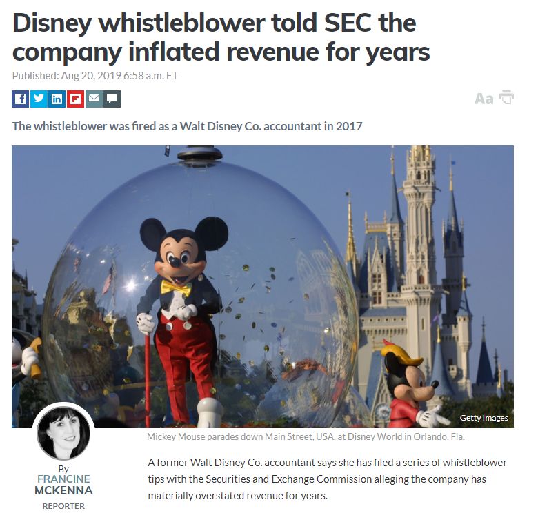 无奈之下,库巴只得于2017年向证交会提供了相关举报材料,但此后不到一个月,她便遭到了迪士尼的解雇。当年10月,库巴向美国劳工部职业安全与健康管理局提出了迪士尼报复举报人的投诉,可迪士尼在回应该部门调查时表示,库巴在工作场合对同事的抱怨没有合理依据,这一行为不仅不合时宜,而且对公司名誉造成了伤害。