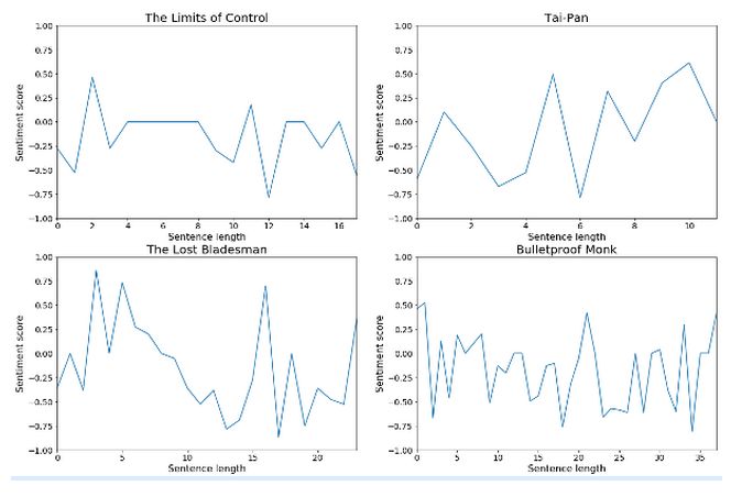 而第二张则是不成功的电影的情感分析,它表现出较少的情感波动。电影《控制的极限(The Limits of Control)》和《迷失的刀锋战士(Lost Bladesman)》都有消极的开头和结尾。电影《大锅(Tai-Pan)》以消极的开头,以积极的结尾。电影《蓝舌和尚(Bluetproof Monk)》的开头和结尾都是正面的,但是在故事发展的过程中,大多数人的情绪得分都是负面的。因此,这表明情绪变化的频率可能预示着电影的成功。然而,情绪的两极对预测一部电影的成功影响甚微。