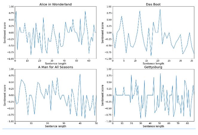 上面两张图中,第一张里面的电影《爱丽丝梦游仙境(Alice in Wonderland)》的开头和结尾都很积极,电影《靴子(Das Boot)》和《一个男人(A Man for All Seasons)》每一季的开头和结尾都是消极的。电影《葛底斯堡(Gettysburg)》展示了命运的逆转,开始时是消极的,结束时是积极的。人们普遍注意到,这些成功的电影有频繁的情绪波动。
