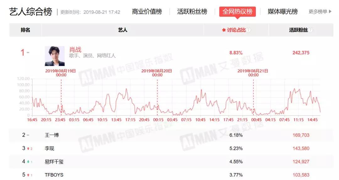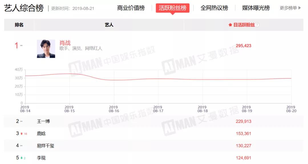 AIMAN中国娱乐指数显示,在全网热议榜和活跃粉丝数中,肖战与王一博均分居冠亚。