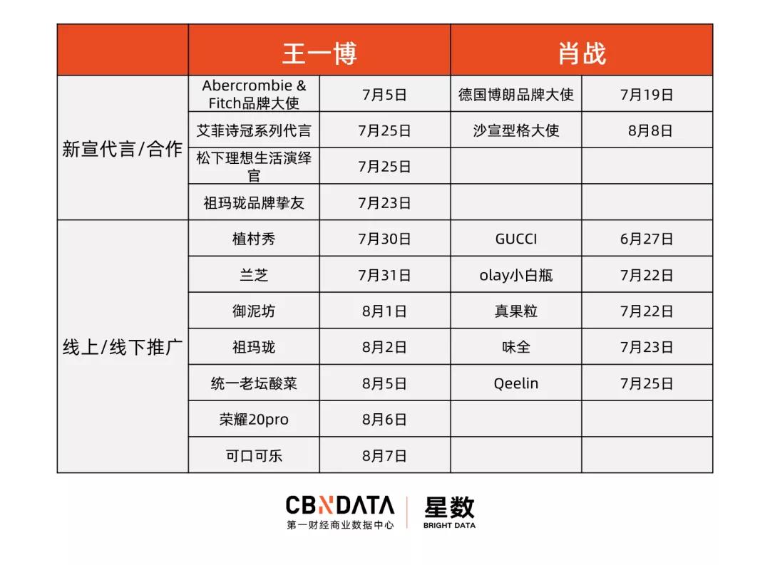星数数据统计,仅在《陈情令》播出后,王一博便新增品牌代言4个,肖战新增品牌代言2个,线上线下推广活动次数大幅增加。在AIMAN中国娱乐指数的7月艺人商业价值榜单中,肖战一下子上升了47位,排名跃至第三,仅次于易烊千玺和杨紫。