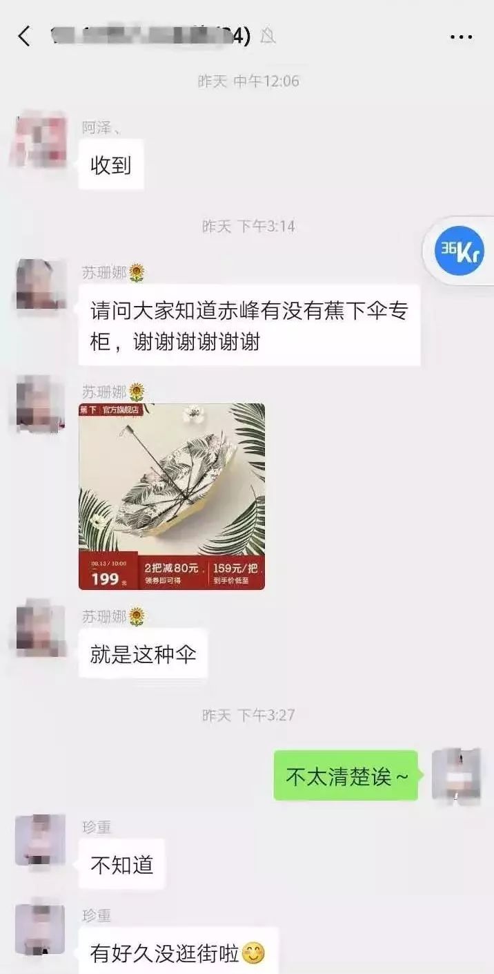 近日,用户肖瑞向燃财经爆料称,8月14日下午,有朋友在微信群里询问“赤峰有没有蕉下伞专柜”,他回答称“不太清楚”。第二天上午,他就收到当当网的短信,推送了“蕉下小黑伞清仓99元”的购买链接。