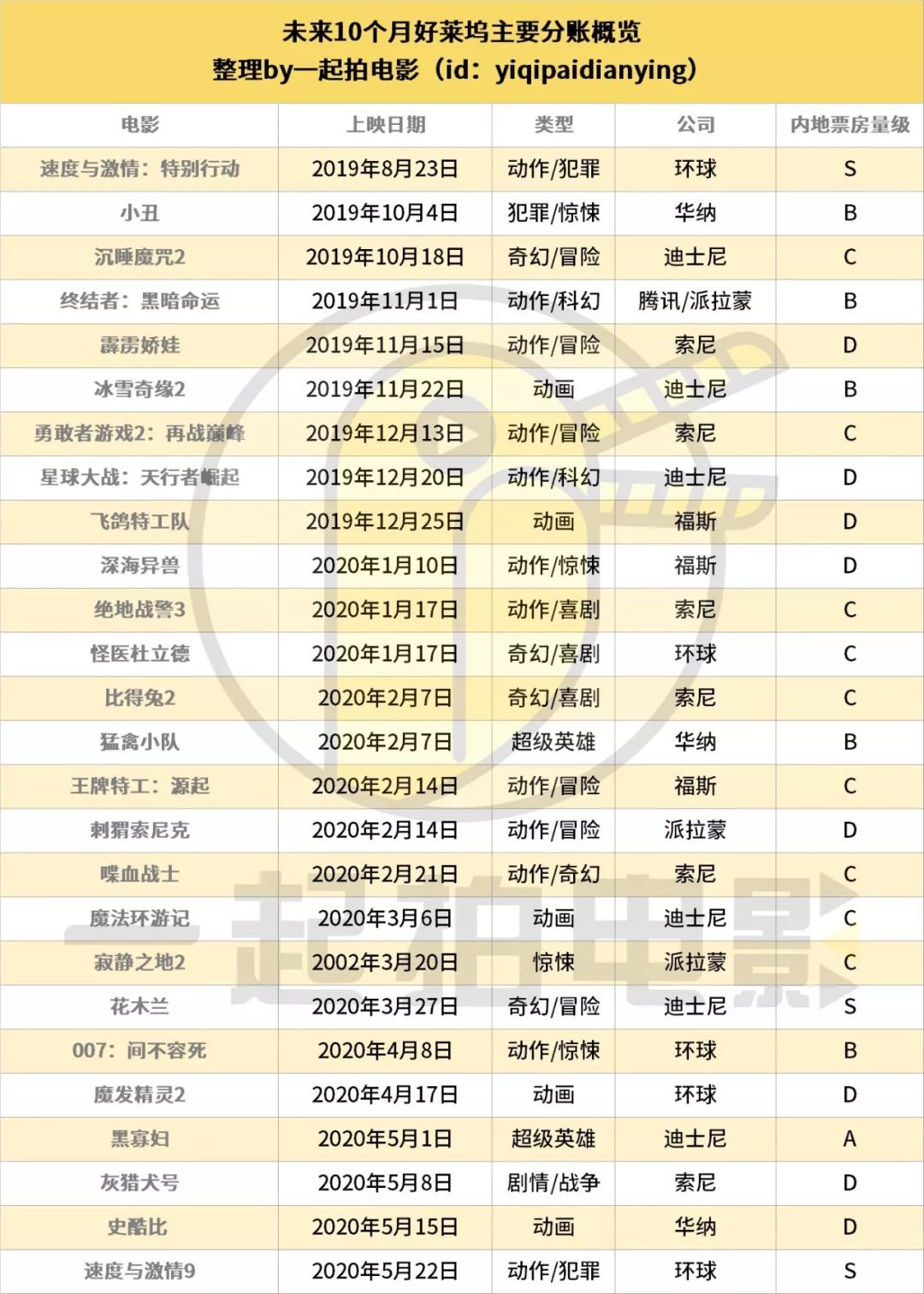 我们总结整理了从这部《速激情外传》到明年5月《速度与激情9》截止的所有好莱坞进口分账片的重点项目,片单并不亮眼。不仅没有任何能够达到20亿+量级的影片,甚至连10亿+量级的影片,都得等到明年三月底开始的《花木兰》才能够达到。