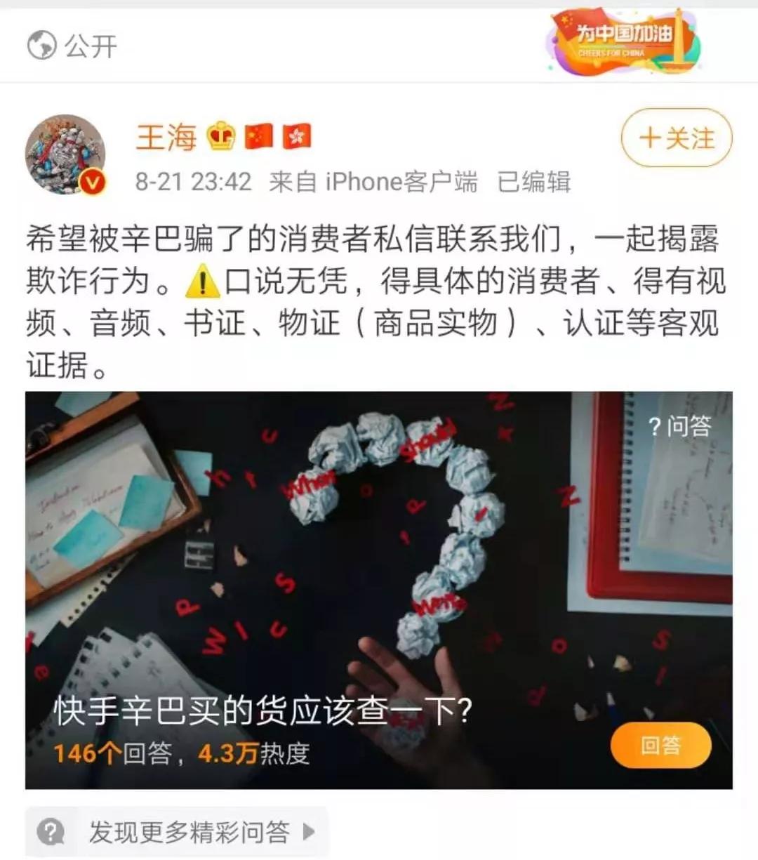 精通消费者维权之道的微博大V王海显然就是因为“网红结婚花5千万请42位明星”的热门话题才发现了这个天上掉下来的打假对象,前天子夜,王海开始转发指控辛有志及其妻子初瑞雪是“微传销头子”、“骗了多少宝妈”的跟帖,广为征集受害者。
