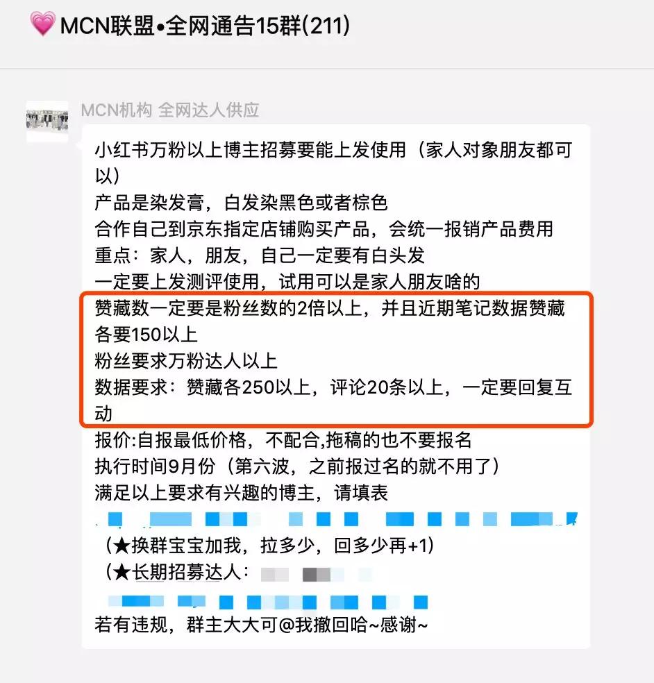 Tech星球(微信ID:tech618)也注意到,在小红书MCN通告群内,多数机构也会对赞藏数与粉丝数的比例,笔记近期点赞收藏总数等数据做出具体要求。