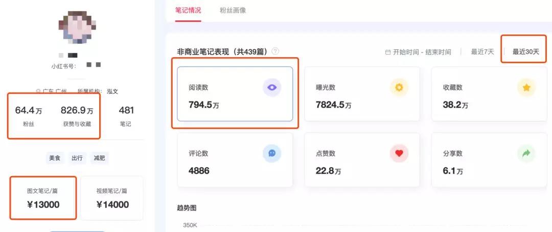 品牌方同样在意的数据还有笔记阅读数,对比这两位博主的30天内的各项数据指标可以看到,尽管KOL粉丝数是KOC的6倍多,但其总阅读量仅是KOC的2倍。再来看价格,KOC报价是KOL的四分之一。