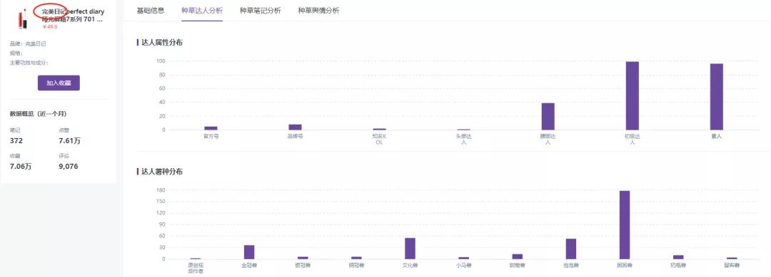 当然,也有一些新品牌更愿意亲青睐素人及KOC。根据小红书数据分析平台千瓜数据,过去一个月,在多平台刮起热潮的完美日记口红,小红书的投放账号中80%是素人或者说是KOC。