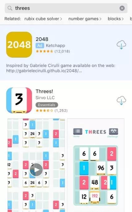 在商店搜索Threes的时候,会弹出Ketchapp的《2048》广告