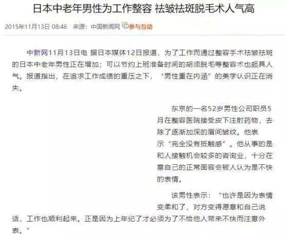 迫于无奈,越来越多的老年人不得不借助整容手术来增加职场力。东京一名66岁的男职员因工作需要,果断在整容医院接受皮下注射药物,去除眉间皱纹和老年斑。