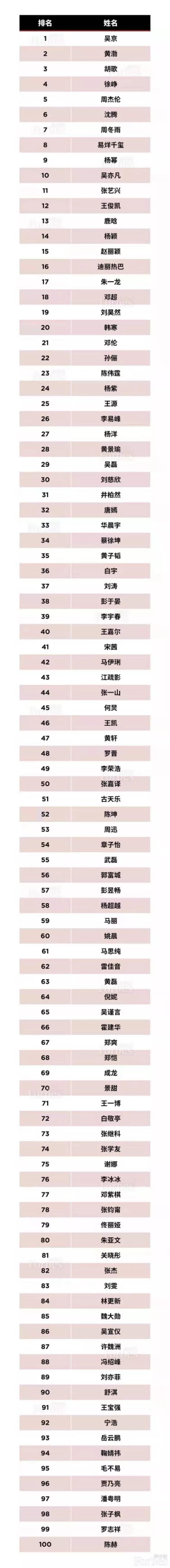 让外界震惊的是,与吴京、黄渤、胡歌等重磅演技咖同登“福布斯中国100名人榜”的,除了周冬雨、TFBOYS等90后新生代外,蔡徐坤、杨超越、吴谨言等从网络平台崛起的艺人也纷纷跻身名人榜。
