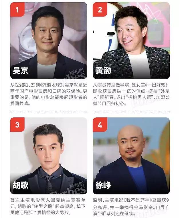 “早期名人榜上榜者歌手、演员、主持人、导演等的界限非常明显,而近几年的榜单可以发现艺人跨界已经成为常态,你很难再去单一地定义他/她是演员还是歌手。社交媒体的崛起也在改变以往的造星方式,上榜者们拥有更多的表现机会。”对于中国名人的变化,Maggie了如指掌。“演而优则导”是今年上榜名人的一大特色:吴京、黄渤、徐峥均是从演员到导演,他们分别位列第1名、第2名和第4名。