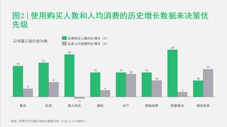 以母婴的二级行业为例(按天猫平台分级方法),通过比较八个品类的购买人数同比增长和人均消费同比增长情况发现,绝大部分母婴品类目前仍主要依靠提升购买人数(渗透率 Gain)驱动增长(参阅图2)。