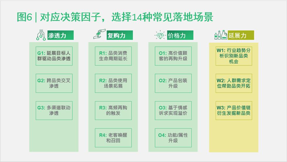 第二步,选择落地场景:针对各品类不同的决策因子,选择相应的落地场景,即采用什么举措来实现增长。以下是BCG总结的14种常见的落地场景(参阅图6)。值得注意,这些场景绝非穷尽所有的增长手段,企业完全可以根据自身所处行业的特点和企业能力优势,开发出创新的落地场景。
