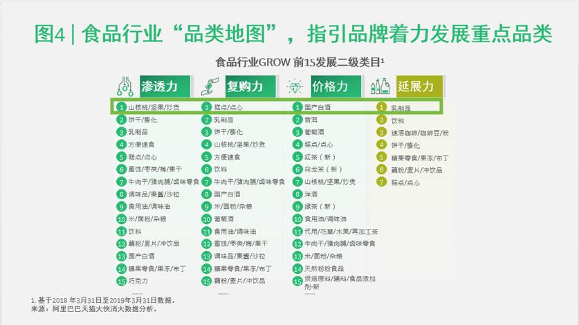 基于上述方法论及大数据分析,BCG与阿里巴巴联手打造了六大行业的“品类地图”——将最适合每个增长方向的15个二级品类按潜力高低排列出来。以食品行业为例,分析发现最应提升人群渗透率的是山核桃/坚果/炒货;而糕点最需要提升复购率;国产白酒亟需品牌升级,提升客单价;乳制品可以通过开发新品类来提振增长(参阅图4)。