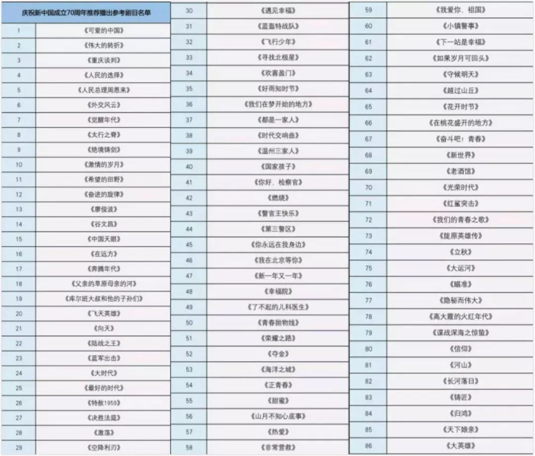 从本周起,首批献礼剧陆续上线,其中囊括爱情、军旅、创业等多种题材。按照广电总局发布的《关于做好庆祝新中国成立70周年电视剧展播工作的通知》,从8月开始,总局将开启重点电视剧“百日展播”活动,展播活动遴选86部剧供全国各级电视台选购,娱乐性较强的古装剧、偶像剧不得播出。