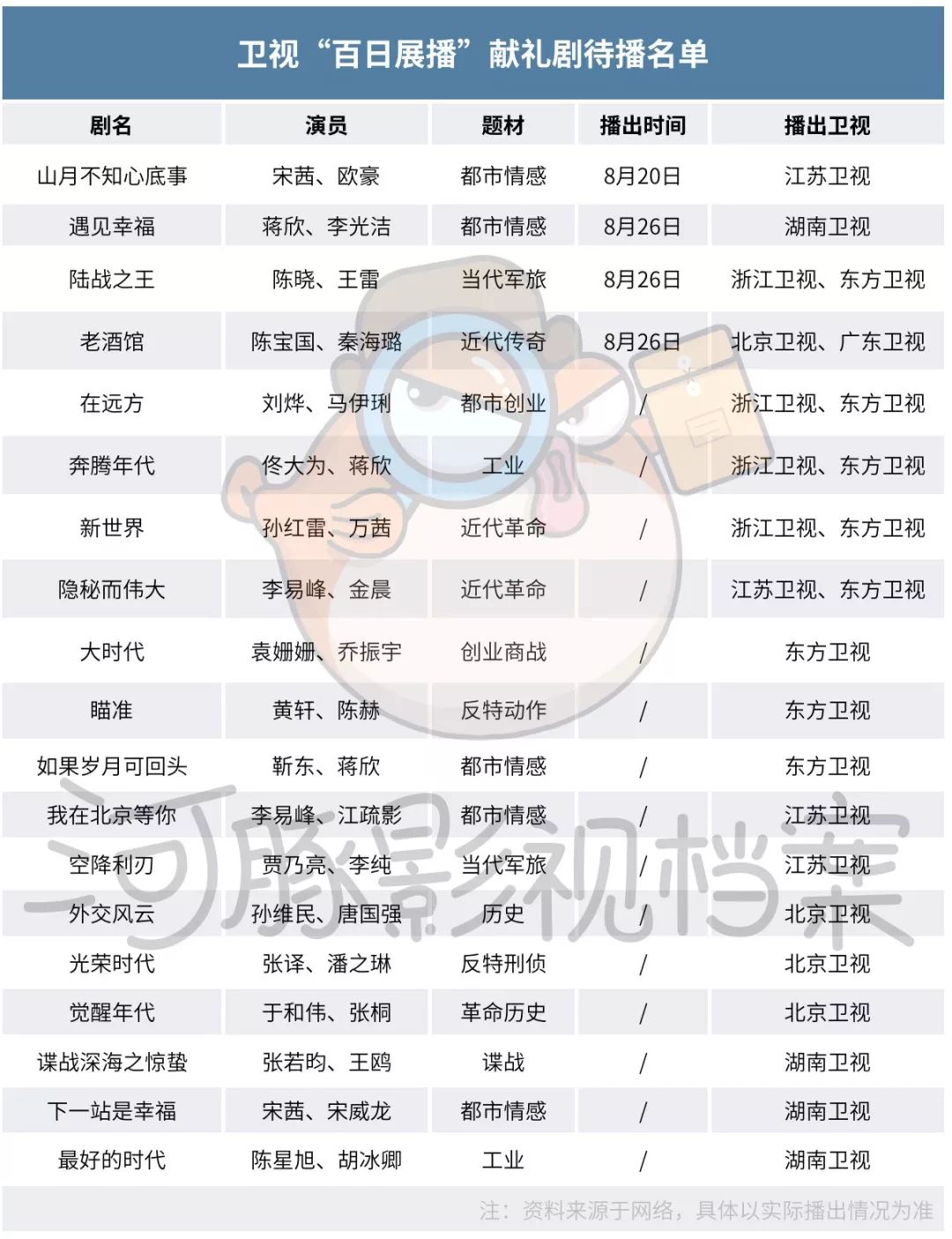 最终各平台排播时,也会考虑到竞争因素。比如,同期各大平台尽量会播不同题材的献礼剧,涵盖不同年龄段的观众。除湖南卫视外,其他卫视大多采用拼播模式,最近要播的《老酒馆》,北京卫视就拉上了以往没太多交集的广东卫视拼播。之前还传出消息有可能“一剧三星”,还会在山东卫视播出,不过最后该方案并没有施行。