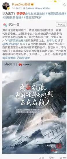 华为官方微博春节前宣传《流浪地球》,导演郭帆转发互动