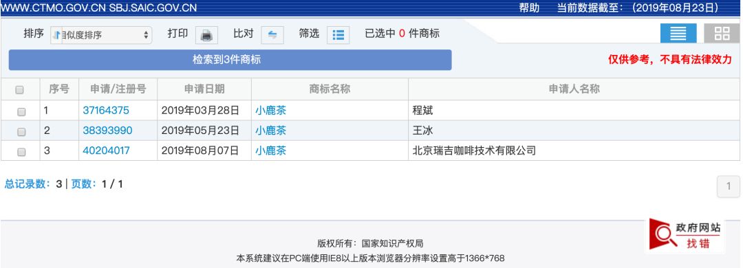 经查询可以发现,包括瑞幸在内的三位申请者均申请注册了第43类【4301】群组“小鹿茶”商标。不过商标申请进度有所不同。