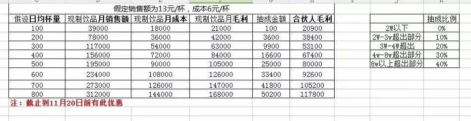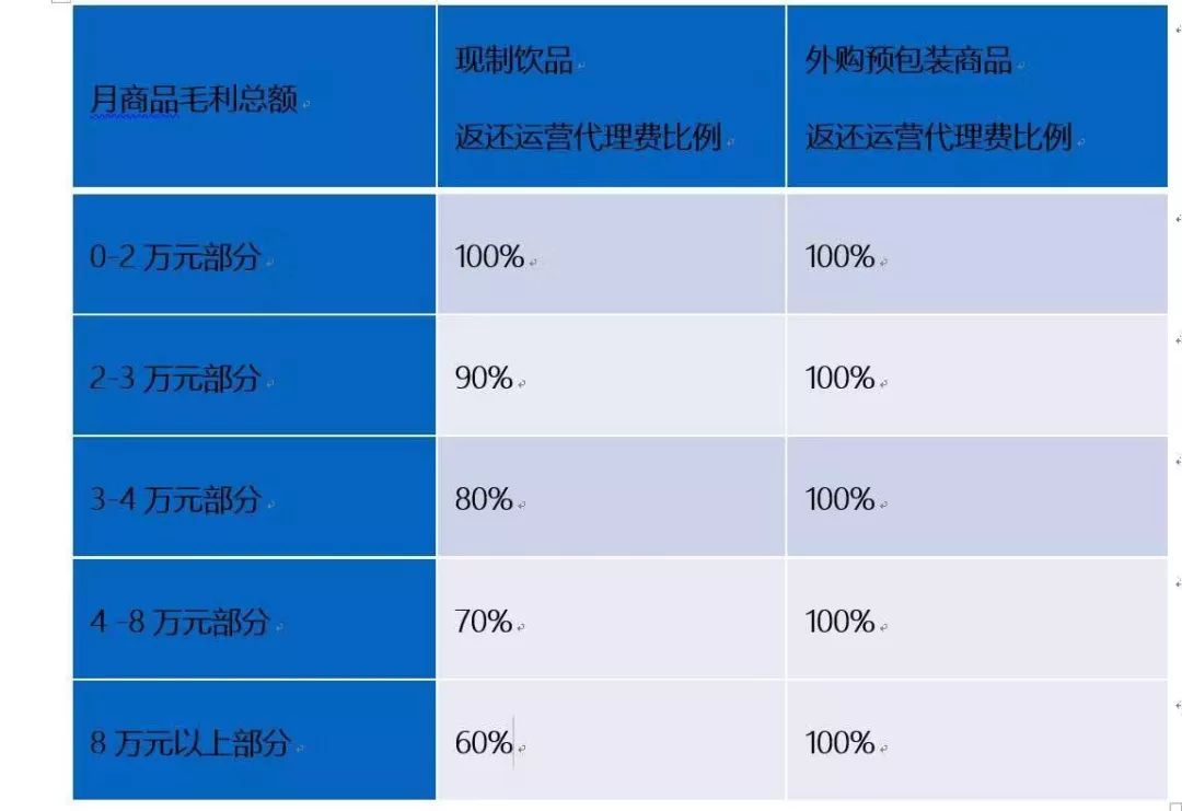 利润分成则采用阶梯式抽成方法。不过对于现制饮品和外购预包装商品,在返还比例上有所不同。