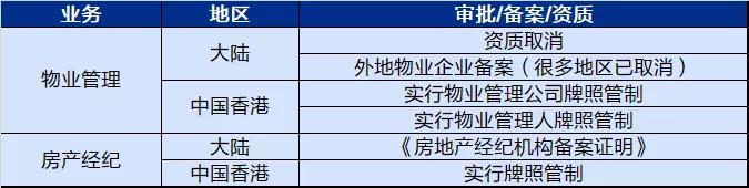 表:大陆和中国香港地区物业和经纪业务的准入门槛对比