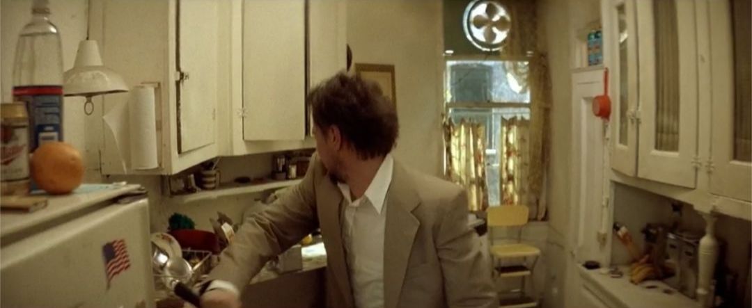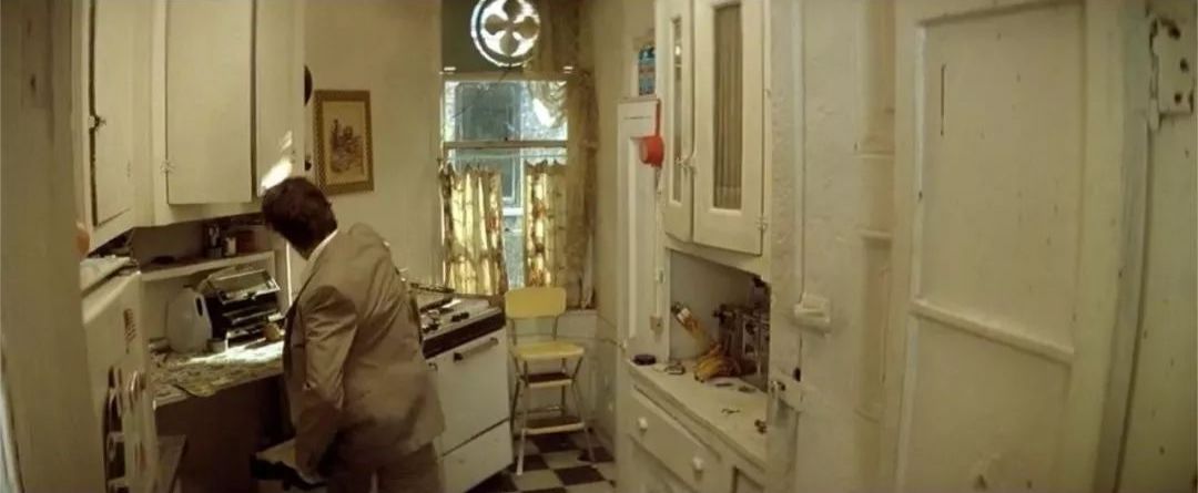 在美式风格中,厨房兼具家庭交流功能,本应是比较大的空间;但在影片中,厨房逼仄狭小,而且户型不规整,呈三角收缩,离餐厅和客厅都有一段距离。像是拿家里最没用的一个角落来作为厨房。