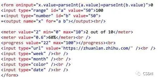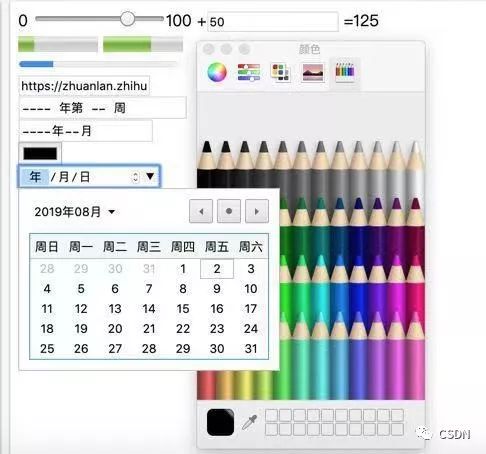 早期的表单元素,我们可以从收音机里挖到它们的本源。但经过20年来的发展,网页世界也有自己的创新,各式各样的日历、调试器,于是它们成为浏览器的自带控件了。下面是一些新标签:<meter>、<progress>、<outer>、 <datalist>,此外更多功能是复用到 input 标签,各种类型的日历、月历、年历、时间。