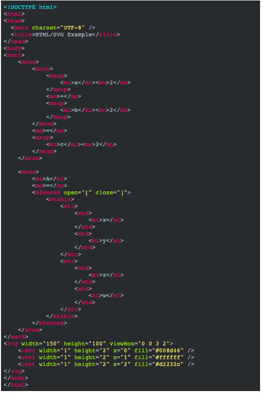 因此多文档的混排在IE4~8的情况是 HTML+VML+XML, 在其他浏览器则是 HTML+SVG+math,并且 SVG 里有 <foreignObject> 再加载 HTML 文档。在 HTML 规范转交给 WHATWG 的今天,SVG 与 math 继续交由学术性更强更严谨的 W3C 所维护升级。毕竟 HTML5 有许多新功能是玩票性质的,而学术性的东西则不能这样弄。