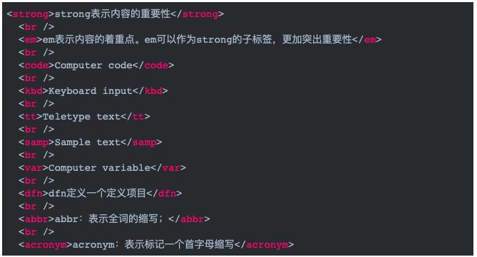 这是覆行 SGML 的样式显然功能,于是才出现这类标签,常见的有 s、u、i、b、big、small、sub、sup、center、font、br、nobr、hr。在强调语义化的时代,除了 br、nobr、hr 都完了。此外,还有一些不起眼的标签,被忘了,又赋以特殊含义又活下来,如:code、kbd、samp、cite、tt、var……它们自带样式,通常以另一种字体特别显示。