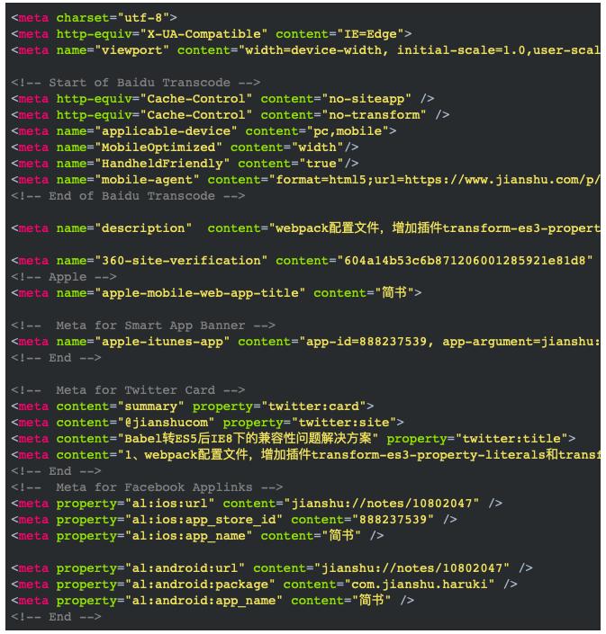 下面是简书的 meta 标签使用情况,它可以做许多事情,如百度 SEO、360 SEO、移动端的水滴屏设置、缩放设置,还有外国的一些社交网站的设置,需要有一些专门的知识才能玩得转。