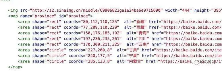 地图模块涉及两个特别的标签 <map>、<area> 及一个常见的 <img> 标签。map 标签起来统帅的作用,而 area 标签则起着与其他标签不一样的触发区域。一般的可视标签,都是呈现为矩形。而 area 标签则根据它的 share 属性呈现为各种形状及不规则的多边形。