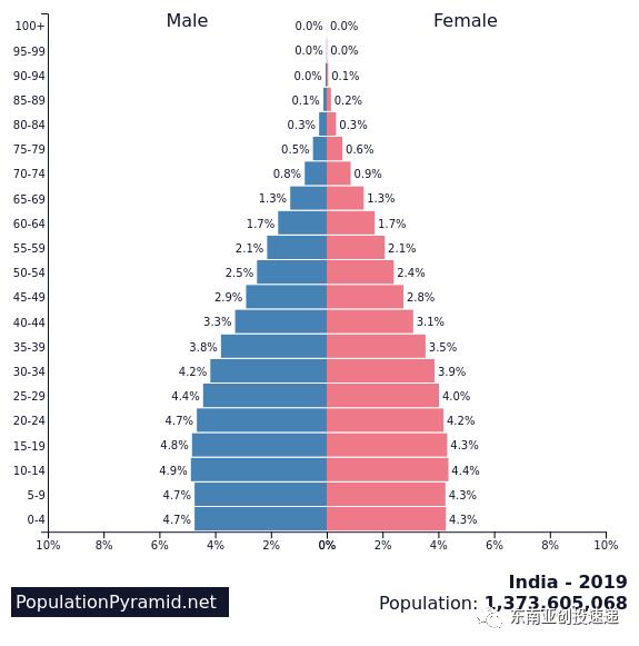 上图所示的印度市场人口结构图也正说明了,随着印度人均 GDP 在2018年成功突破2000美元大关,年轻的人口结构将释放出巨大的经济增长红利。可以类比的是,中国市场大约在2006年时人均 GDP 突破2000元大关,并在随后10年间翻了近4倍,到2019年已接近1万美元。这也正是中国互联网与科技创业最为蓬勃发展的时间窗口。