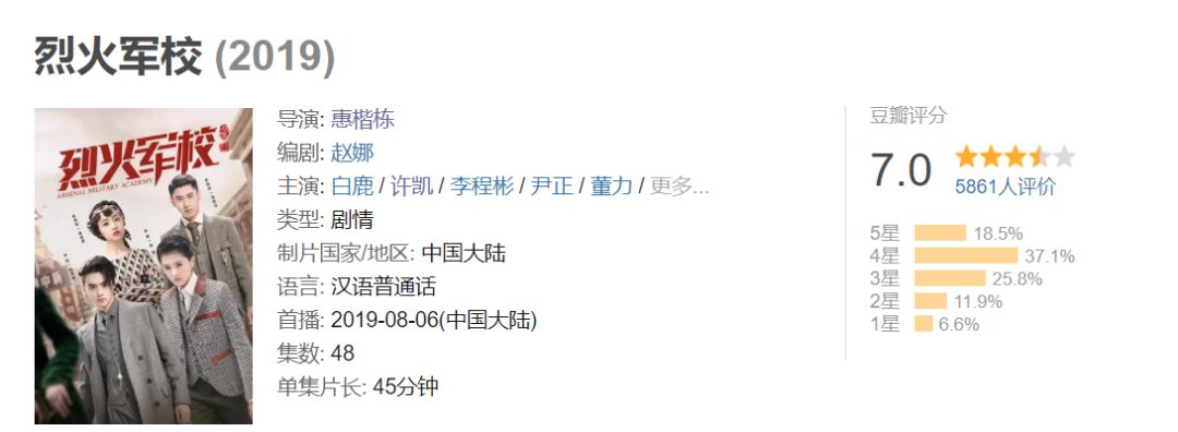 播出过半,电视剧《烈火军校》相关剧情话题多词登入微博热搜,豆瓣开分伊始即达7,猫眼网剧热度榜第二,稳居爱奇艺站内热度榜第二,剧中体现的正能量内涵也获得了光明日报、人民日报等主流媒体的点赞,对比在网上口碑黑红参半的爆款剧集,网友对《烈火军校》一直稳定的给予安利推荐。