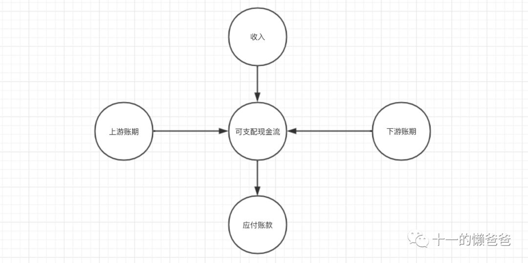 可支配现金流=收入+上游账期+下游账期-应付账款。
