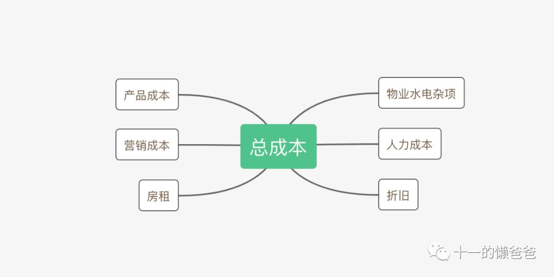 总成本=产品成本+营销成本(包括广告、活动等)+房租+人力成本+折旧+物业水电杂项(部分mall会收pos使用费和宣传费等)