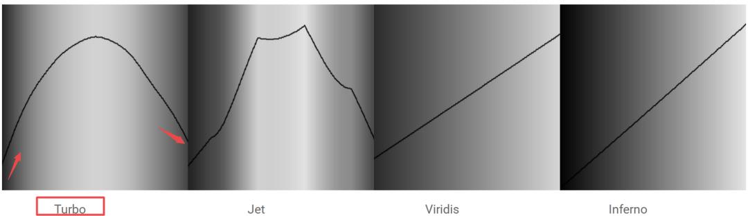 Turbo模拟了Jet的光强特性,映射的强度从低到高在从高到低,但却没有显著的强度带阻隔。下图显示了四种不同颜色银蛇的强度值曲线,可以看到Turbo的强度值基本对称分布,使得它在单侧的斜率几乎是Viridis和Inferno的两倍,在高地两侧将有效的提升对比度。同时低侧的斜率和高侧的斜率不同,这是因为人类感知的蓝色比红色更强。