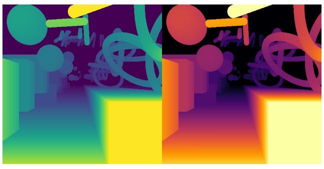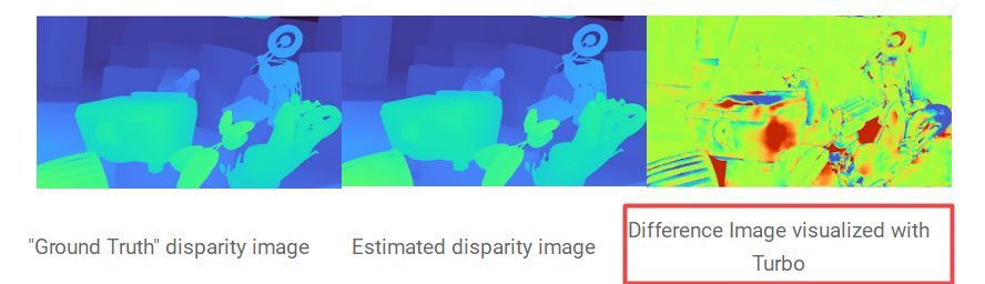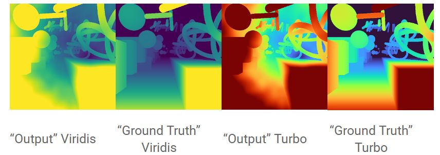 当快速评估两张图像时,基于颜色的比较要比基于强度的比较更容易。例如在单图像深度估计任务中,基准图像与预测图像间的比较,Turbo颜色相较于Viridis就更容易区分和辨别误差。