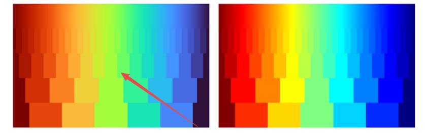 虽然这种低高低的曲线可以增强细节,但却会造成强度的模糊。将彩色图转换为灰度图时会造成较低的值与较高的值得到相同的取值,这意味着Turbo不适合于灰度打印也不适合于罕见全色盲人士。