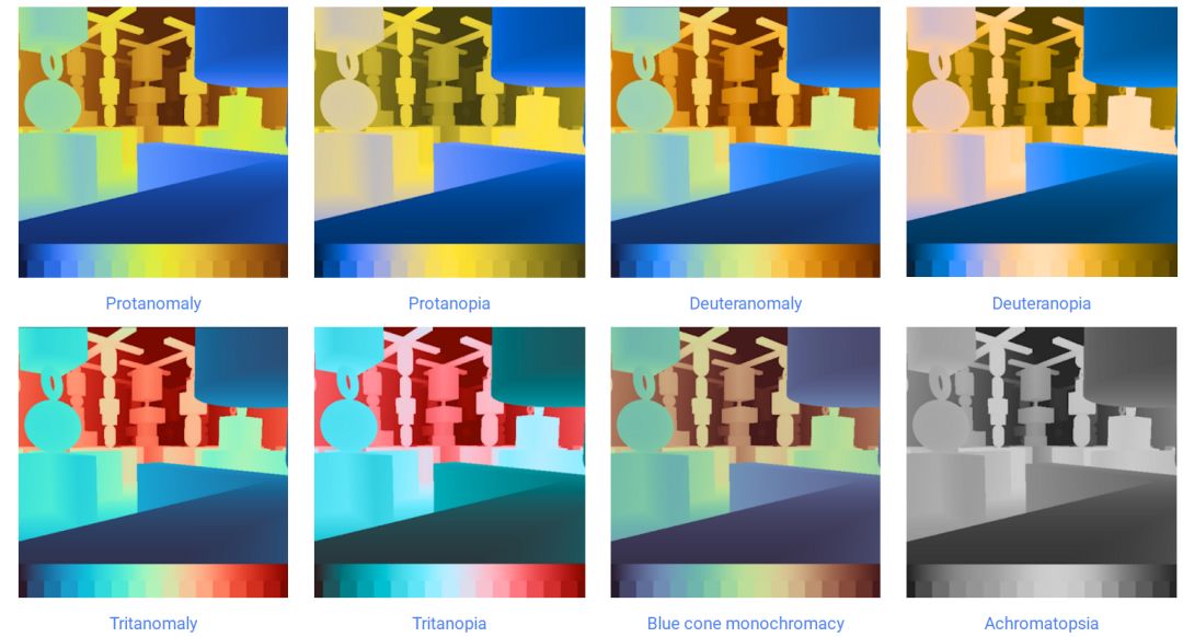 研究人员同时还利用色盲模拟器对这种新的颜色映射进行测试,结果表明除了全色盲人群外Turbo可以保持具有显著区分和平滑的颜色。针对全色盲来说,由于低值区和高值区的灰度可能类似会造成一定的感知模糊。由于全色盲在人口中的比例是三万分之一,所以这套色彩映射可以有效覆盖99.997%的人群。