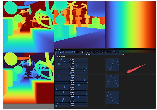 研究人员为了构建Turbo映射,利用一个简单的交互界面来利用七节点的三次样条对sRGB曲线进行调整,并与其它颜色映射进行比较。