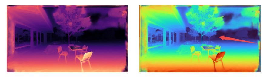 由于颜色和强度的剧烈变化,Jet相较于Viridis和Inferno会削弱背景的细节,最终基于数据呈现出的图像会让人眼遗失很多细节。而Turbo则通过非线性映射将背景进行了强化。下图中可以看到在Inferno中远处的背景几乎无法看清,而Turbo映射中远处的背景数目则依然为人眼所见。