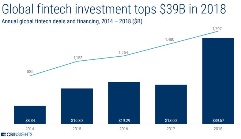 全球金融科技投资总量, 图片来自CB Insights,版权属于原作者