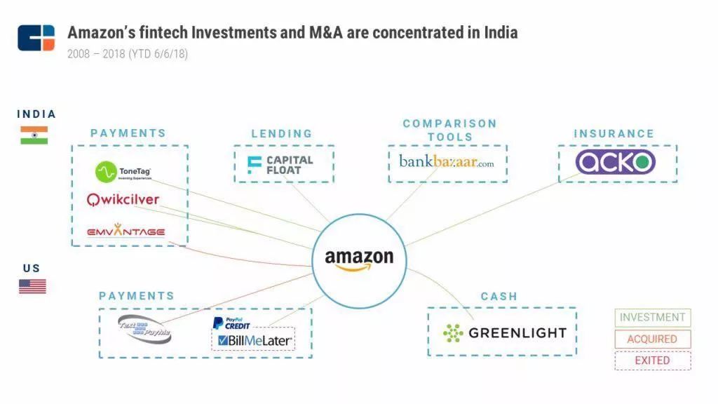 Amazon 金融科技领域投资与并购 图片来自CB Insights,版权属于原作者